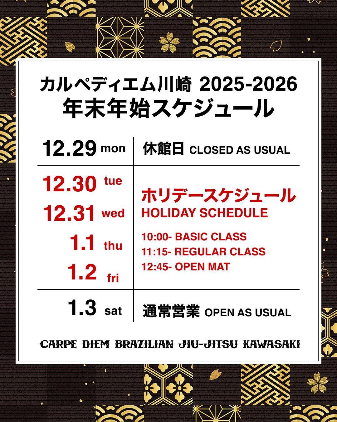 2025年12月30日(火)〜2026年1月4日(日)は、10:00からのBASICクラスにて承っております。
